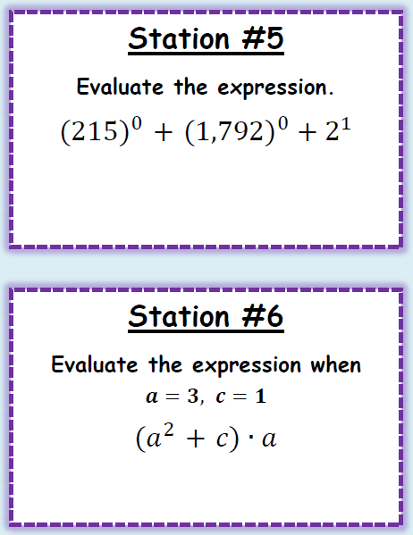 The stations can be taped down and students can rotate around the room, evaluating expressions and following the order of operations as they go!